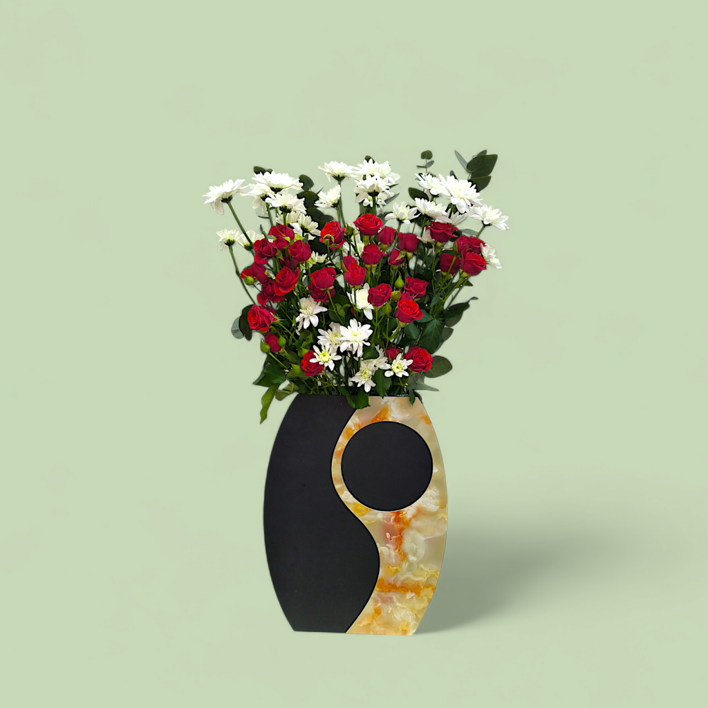 03 أكتوبر تنسيق زهور أقحوان مايسي بيبي ريد روز الطازجة مع مزهرية بيضاوية من الخشب البلاستيكي | ديكور زهور أنيق تنسيق زهور طازجة أنيقة: هذا التنسيق المذهل من زهور الأقحوان والوردة الحمراء الصغيرة هو مزيج مثالي من الأناقة و...