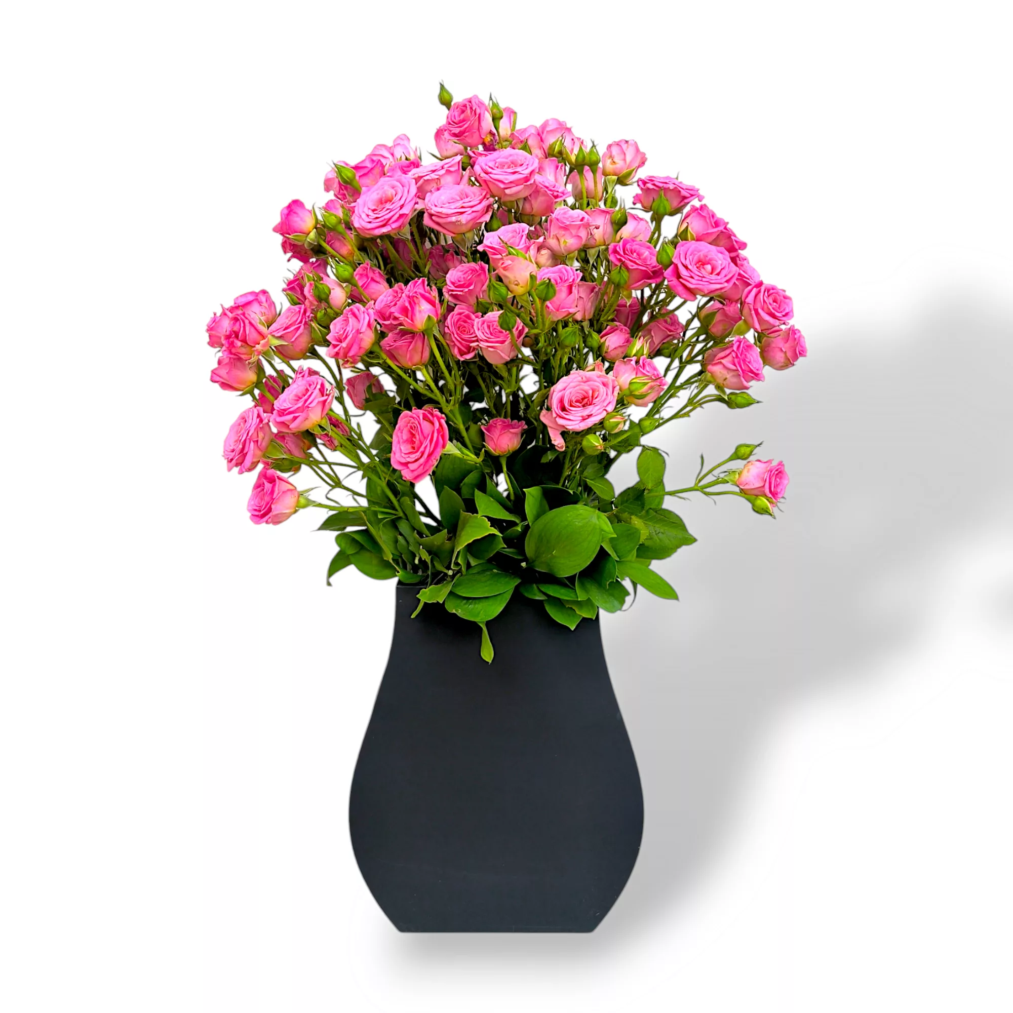 - جاذبية خالدة : تتناغم درجات اللون الوردي الناعمة للورود مع الوعاء الأسود الأنيق مما يخلق تأثيرًا بصريًا مذهلاً ومتناغمًا.