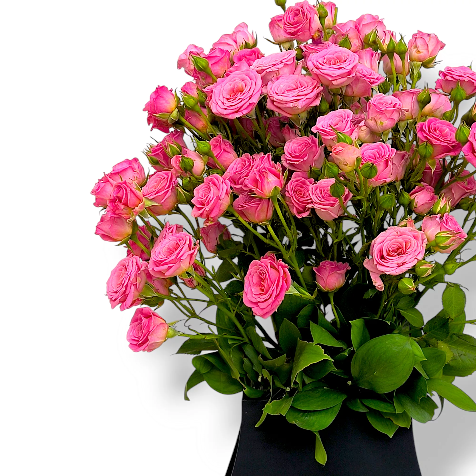 باقة من الورود الوردية الطازجة في وعاء أسود من الخشب الرقائقي – ديكور زهور أنيق