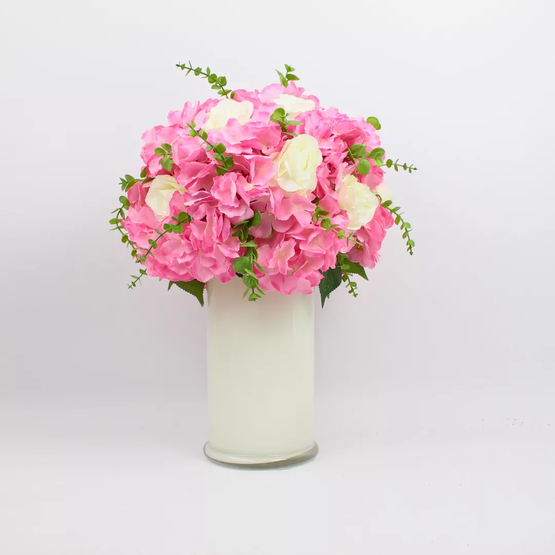 The combination of pink hydrangea and white glass vase offers a fresh, airy, and sophisticated aesthetic, blending seamlessly with most interior styles.