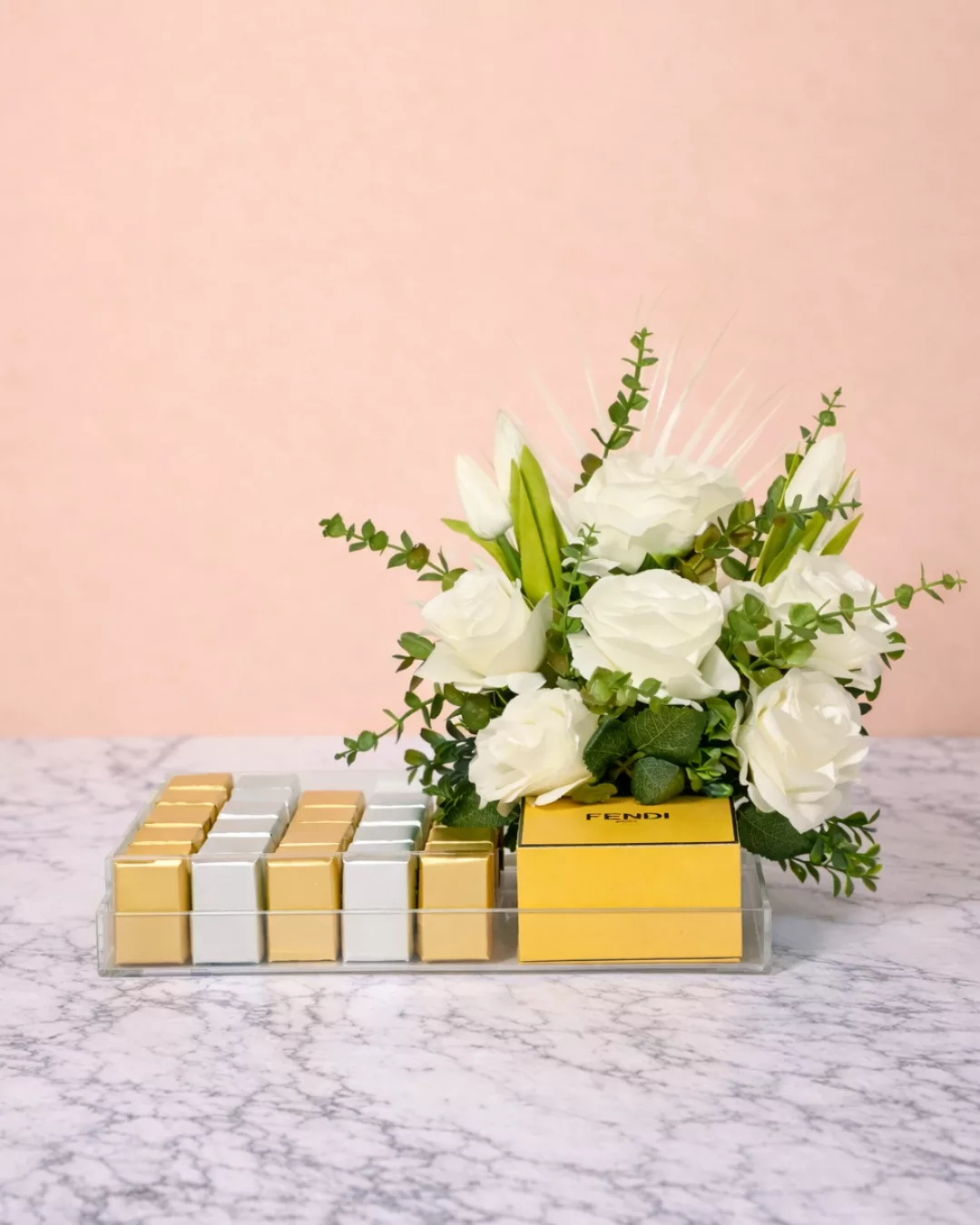 A versatile and customizable tray, perfect for creating unique gift hampers or sweet arrangements.