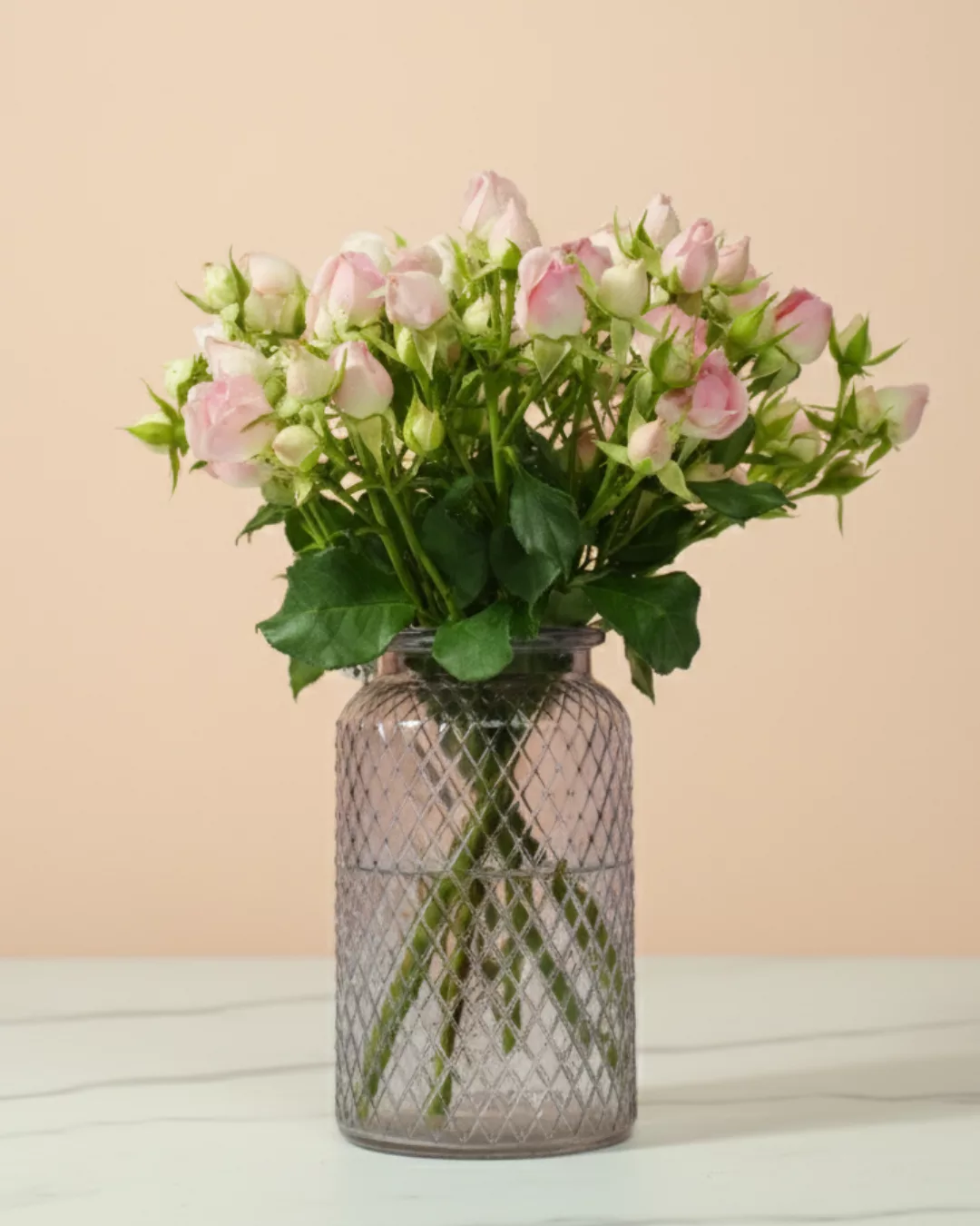 Soft Blush – Baby Roses Arranged in Textured Glass Vase